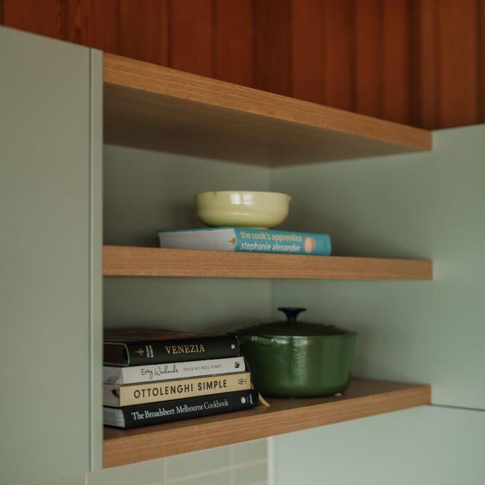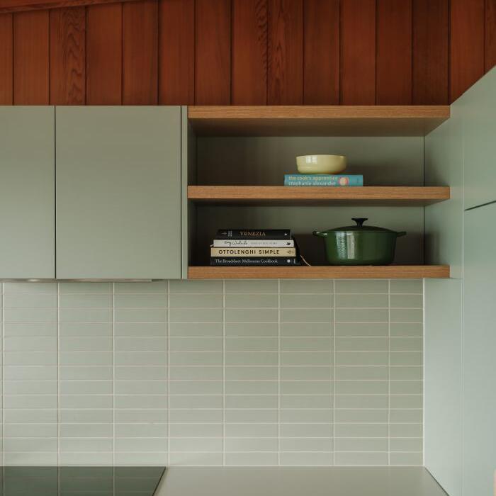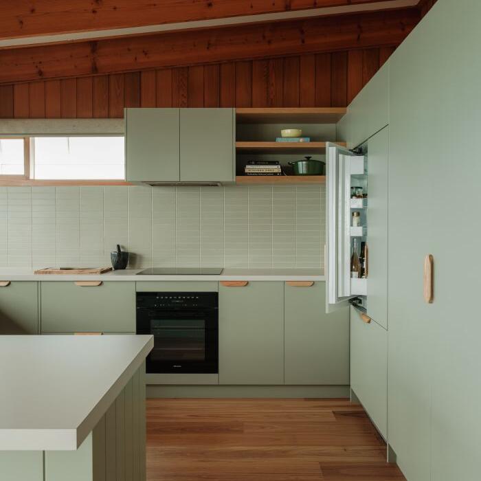 The new kitchen was designed as a modern interpretation of the original — familiar in layout, but elevated through smarter use of space and contemporary functionality. Integrated appliances, generous preparation zones and improved workflow were all incorporated with large-scale family cooking in mind, reflecting the way the owners regularly gather here. A considered colour palette draws inspiration from the surrounding native trees and complements the existing cedar lining boards, creating a cohesive, grounded aesthetic. Hard-wearing floor coverings were selected to withstand frequent use while respecting the relaxed, mid-century feel of the home.